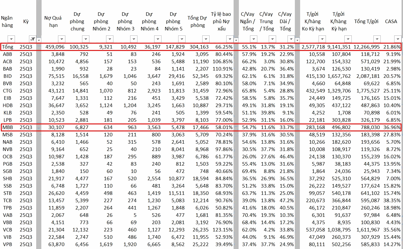 Một trong những lợi thế cạnh tranh cốt lõi của MBB là tỷ lệ CASA luôn duy trì ở mức rất cao (thường xuyên trong Top 3 toàn ngành cùng TCB và VCB).